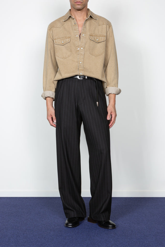 • Pictured with our Wide Leg Single Pleat Trouser in Black Chalk Stripe
