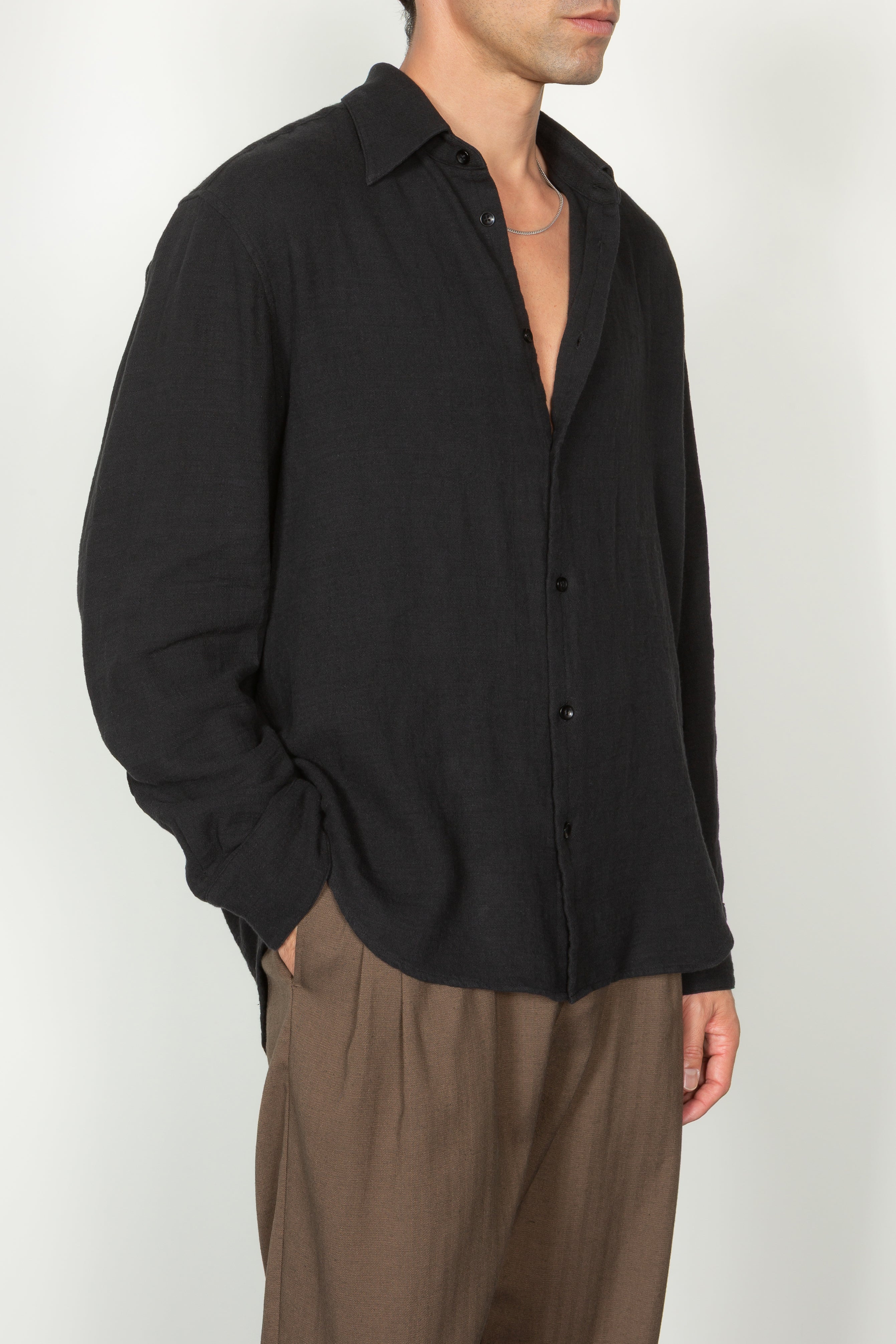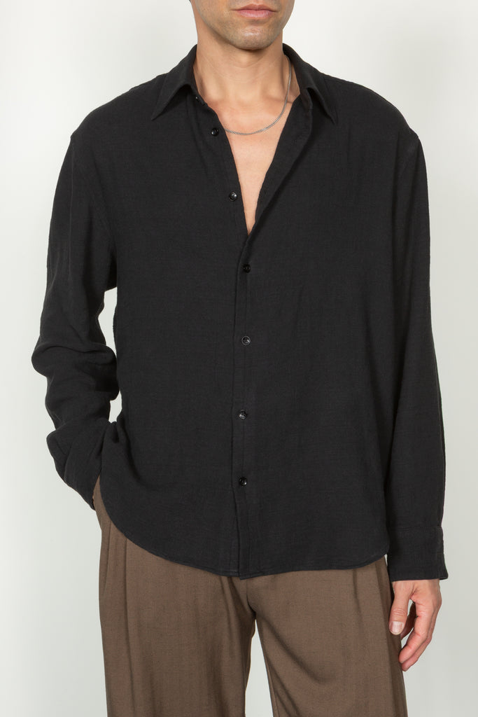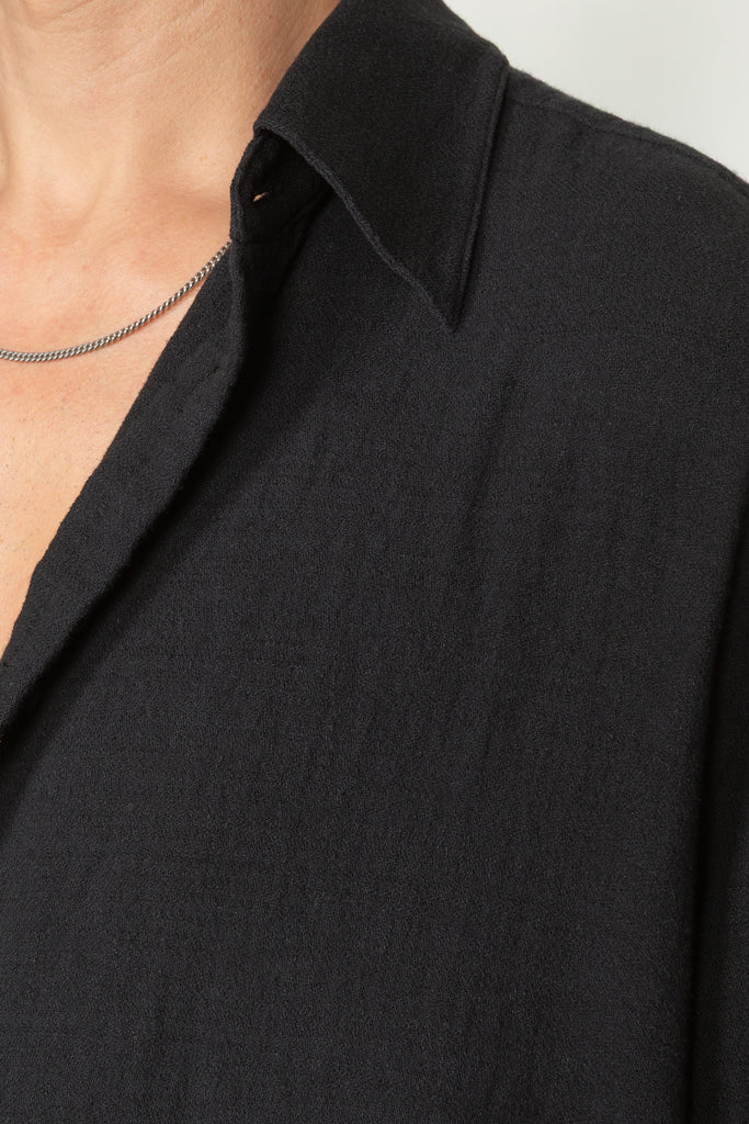 • Features a loose, relaxed fit (not oversized) with a hi-lo shirttail hemline