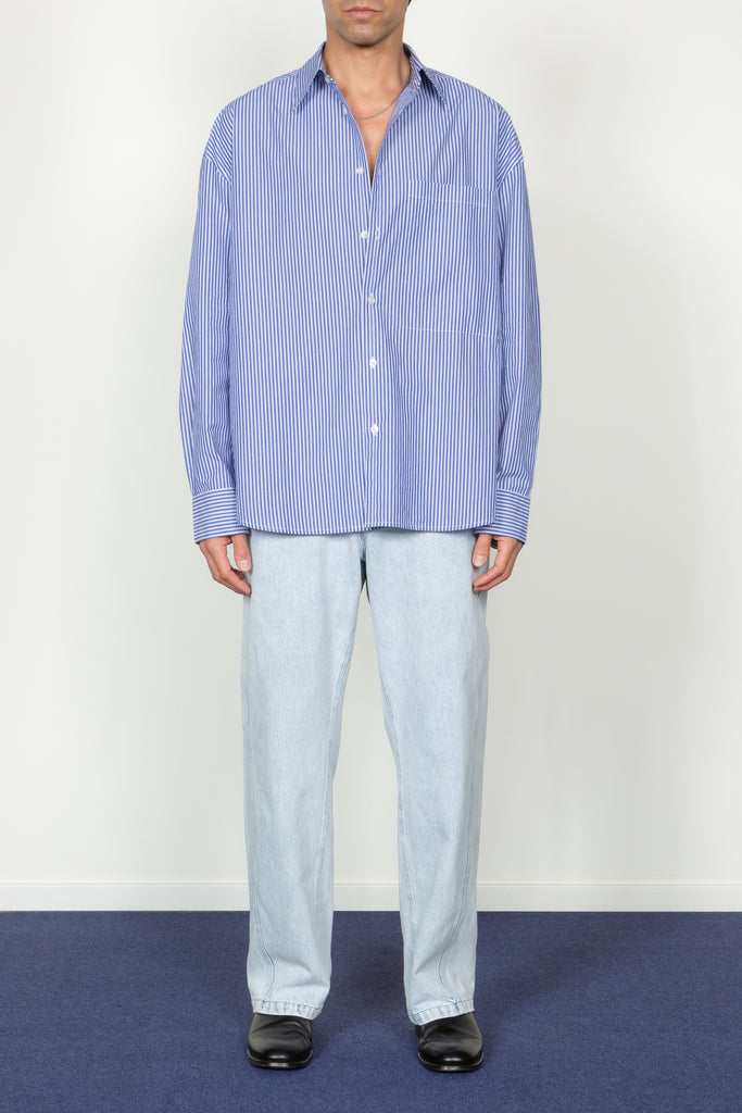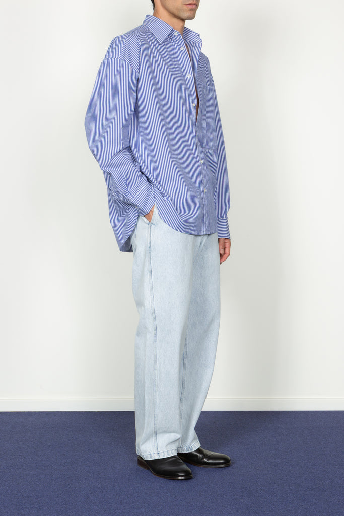 • Our most oversized shirt silhouette. An extremely oversized, baggy fit with dropped shoulders and a hi-lo hemline.